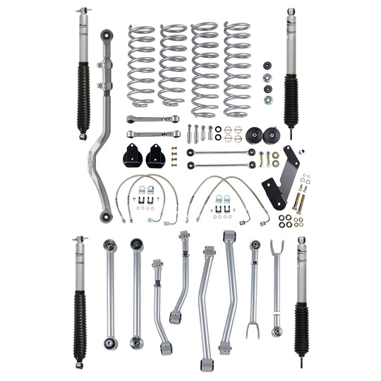 Advanced (3.5–4.5") – Full adjustable control-arm kits or long-arm, front & rear track bars, drag-link flip/high-steer, longer brake lines, and front/rear driveshaft upgrades for high travel. Rock-solid geometry on and off road.